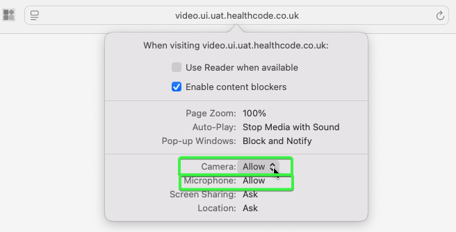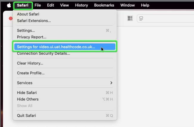 On the video consultation tab, click on the “Safari” menu in the top left corner of the screen, then click “Settings for video.healthcode.co.uk“